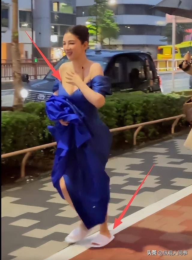 更让人跌破眼镜的是,她脚上并未搭配礼服标配的高跟鞋,反而踩着一双平平无奇的酒店一次性拖鞋。