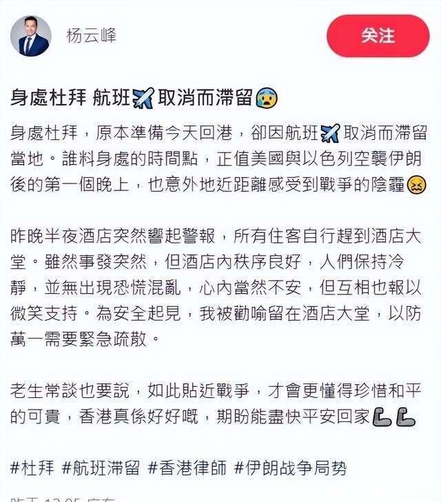 与他们的遭遇类似,翁静晶的徒弟杨云峰也在迪拜滞留。杨云峰透露,自己听到了爆炸的声音,眼前还闪现过火光。他描述说,所有的旅客都聚集在酒店大堂,他估计大家可能会在迪拜滞留一周时间。为了应对这一周的生活,他特别去迪拜的商场购买了必需的生活用品。从杨云峰拍摄的视频中可以看到,往日热闹的街头已经冷清得让人心生寒意,商场也空荡荡的。杨云峰感慨道:当你如此近距离地感受到战争的威胁,你才会更珍惜眼前的和平时光。香港真的是一个太好了的地方,我好想快点回去。