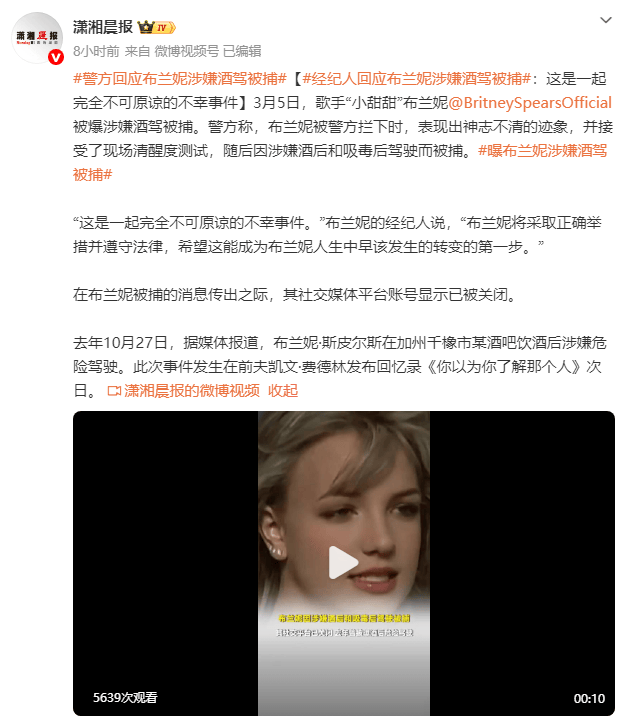 “这是一起完全不可原谅的不幸事件。”布兰妮的经纪人说,“布兰妮将采取正确举措并遵守法律,希望这能成为布兰妮人生中早该发生的转变的第一步。”