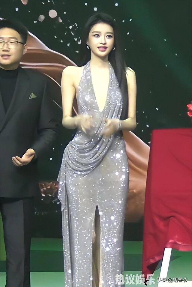 她穿了一身银色高开叉闪钻长裙,贴身的剪裁把身材曲线勾勒得淋漓尽致。