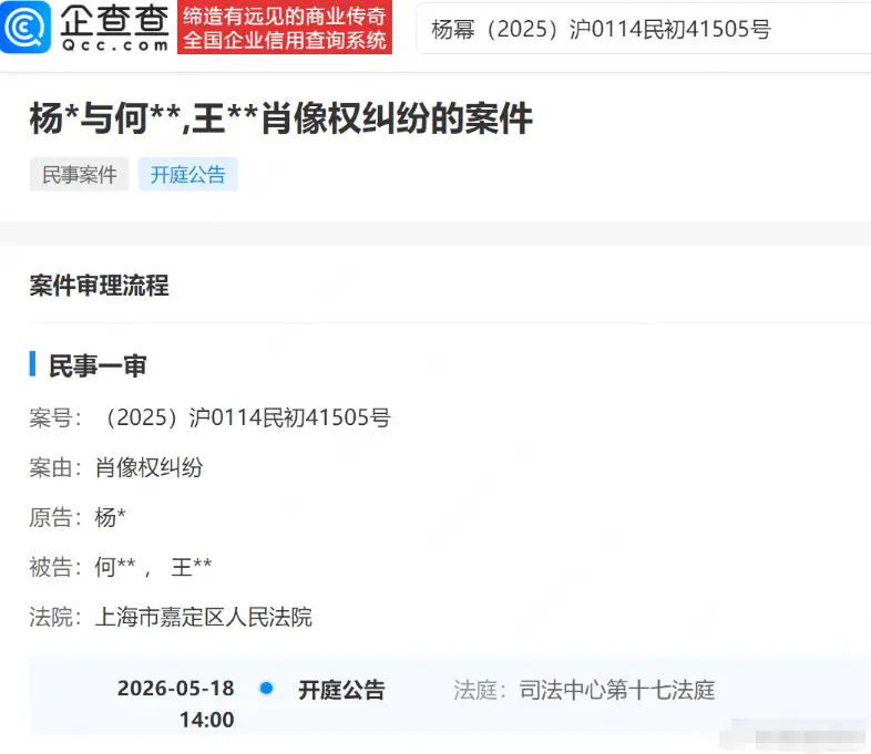 天眼查天眼风险信息显示,近日,杨幂与何某、王某相关肖像权纠纷案件新增开庭公告,原告为杨幂,该案将于5月18日在上海市嘉定区人民法院开庭。