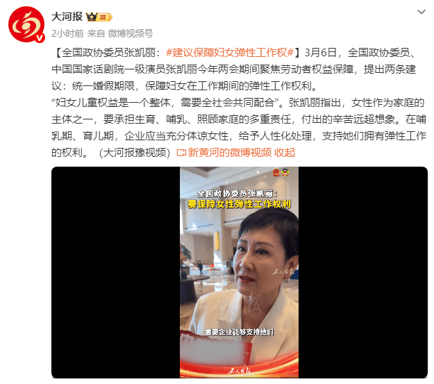 (来源:大河报)3月6日,全国政协委员、中国国家话剧院一级演员张凯丽今年两会期间聚焦劳动者权益保障,提出两条建议:统一婚假期限,保障妇女在工作期间的弹性工作权利。“妇女儿