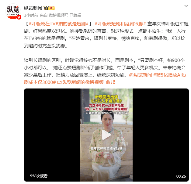 (来源:纵览新闻)童年女神叶璇进军短剧,红果热度双过亿。她接受采访时直言,对这种形式一点都不陌生:“我一入行在TVB拍的就是短剧。”在她看来,短剧节奏快、情绪直接,和港