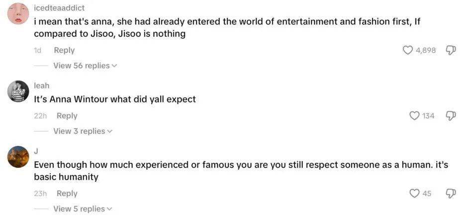 另一方则怒火中烧,认为“地位绝非无礼的通行证”。许多网友,尤其是Jisoo的粉丝,愤慨于温图尔连最基本的眼神致意或短暂寒暄都欠奉。“即便她是传奇,起码的人文关怀和尊重也该有”,这种观点获得了大量共鸣。他们进一步质疑,若换作是同等地位的西方巨星或名流,温图尔的态度是否会有所不同,其中是否隐含了文化或身份上的微妙偏见。