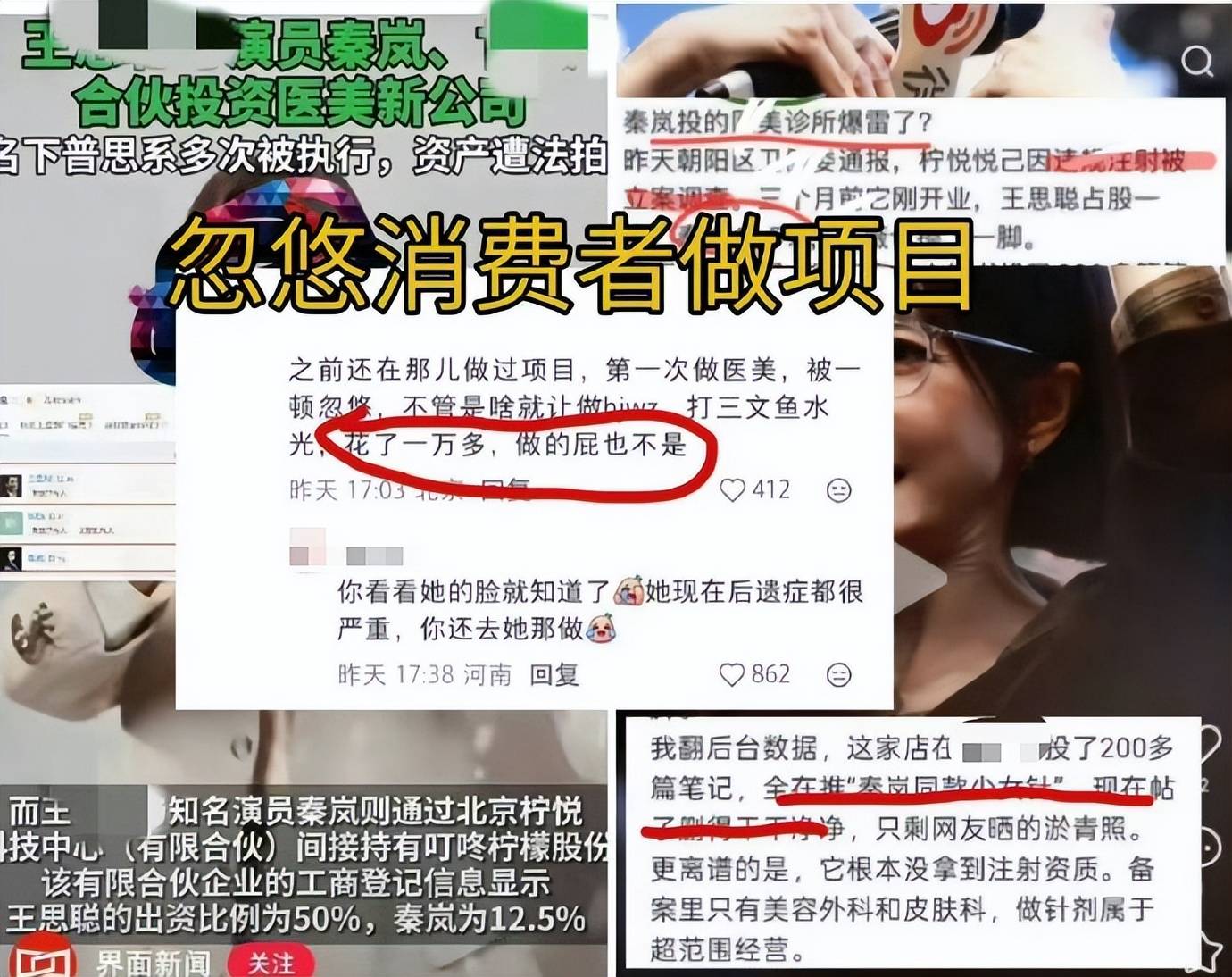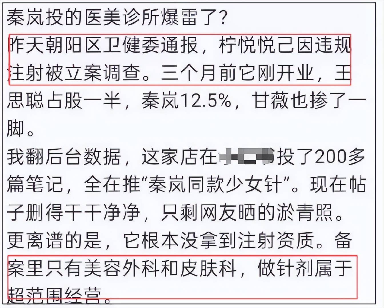 1月份,有爆料称王思聪和秦岚合伙的医美公司暴雷了,因违规注射被卫健委立案调查。根据该公司备案信息可查,只有基本生活服务及美容服务,不具备医疗资格,针剂不在范围内。然而搜索该公司的宣传,不难发现大量集中在美容针方面,数量达到200篇,还拿秦岚当宣传,如今相关内容已删光。