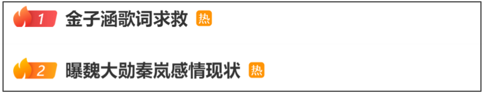 比较巧的是在金子涵提到王思聪医美公司后,“曝魏大勋秦岚感情现状”的热搜忽然飙升至榜一,但点开之后并没有新鲜的内容,十分奇怪。秦岚和魏大勋感情分分合合传了好几拨,几乎每回都是两人新剧开播期,如今两人没有剧集宣传的需要,恋情突然闯入热搜,又引发新一轮猜测。