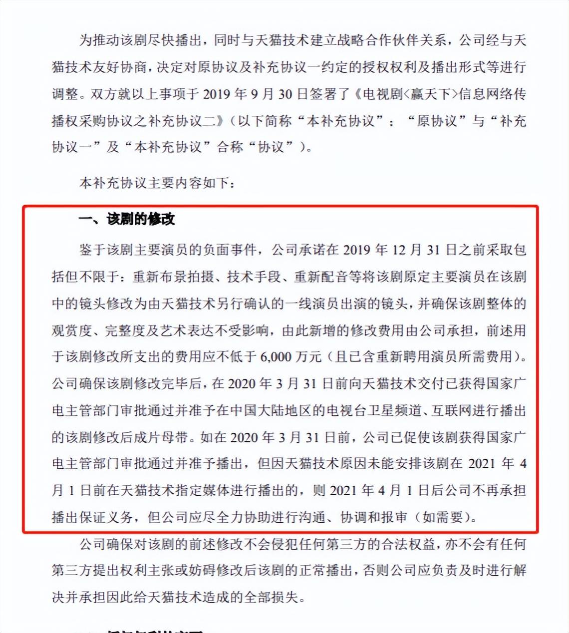 对于补拍唐德影视未曾回应,直至2019年9月底,唐德影视和天猫技术签署补充协议,约定12月31日之前用包括重新布景拍摄、技术手段、重新配音等方法将《赢天下》原定主演在该剧中的镜头修改为另行确认的一线演员出演的镜头。所支出的费用应不低于6000万元。