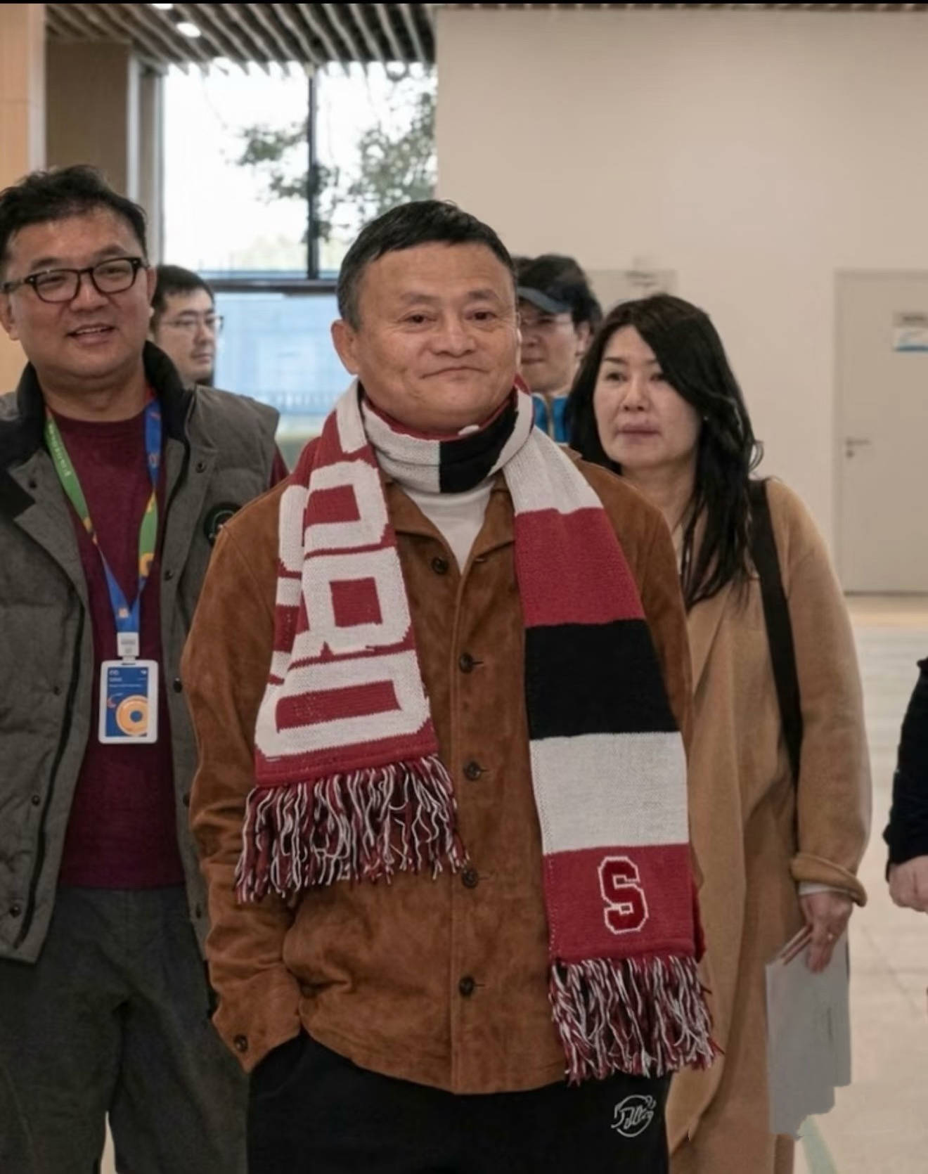 许久没有露面的马云状态很好,当天他穿一件棕色外套、搭配黑色裤子,系一条红白格子的斯坦福围巾,双手插兜的模样随性又霸气。