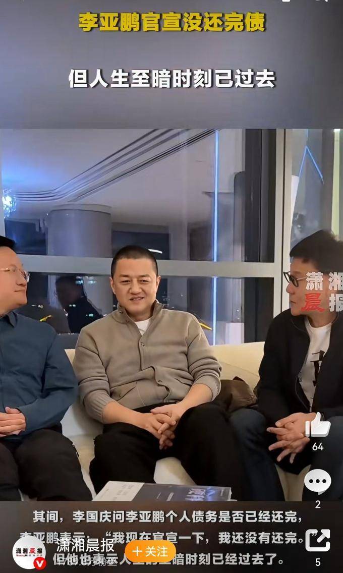 最近,他与李国庆 再次坐 下来探讨公益 话题。 3月5日,当当网的 首席执行官李国庆 公开了 一段视频。 在 交谈中,他顺 带询问了李亚鹏是 否已经 偿还了 他的个人债务。