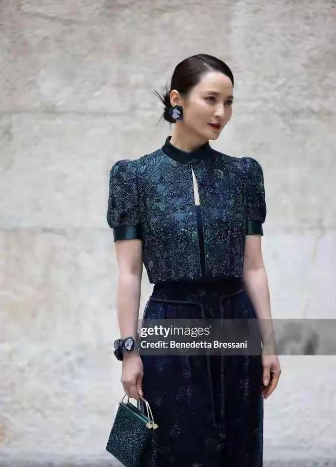 她的衣物上的每一个小细节都展现出了精湛的工艺,而她简约的发型更是增添了她的东方魅力。