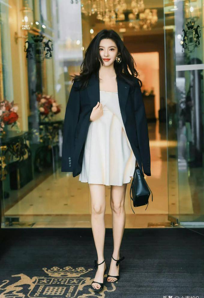 章若楠穿着黑色的西装外套,展现出一种与众不同的御姐气质,她完美地平衡了这两种风格,无论何时切换,都令人为之倾倒。