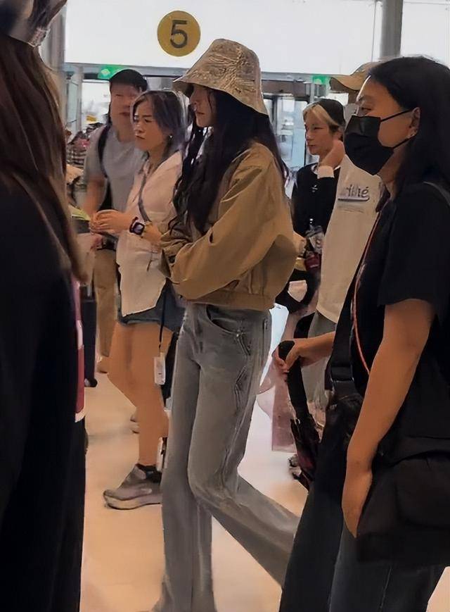 有网友拍了机场生图,照片里她的裤子同样拖地,搭配的平底鞋让整体比例显得有些失衡,完全没了往日穿搭教科书的水准。
