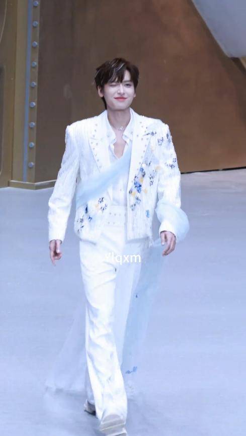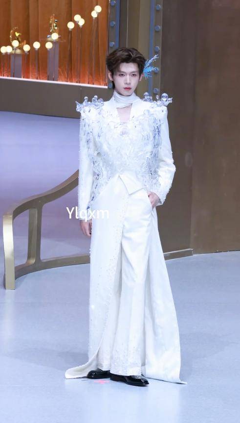 皮皮朱穿了一身白色西装,搭配了一双厚底鞋,大概是想显得高挑一些,可厚重的厚底鞋和他的造型很不搭,反而显得有些笨重。