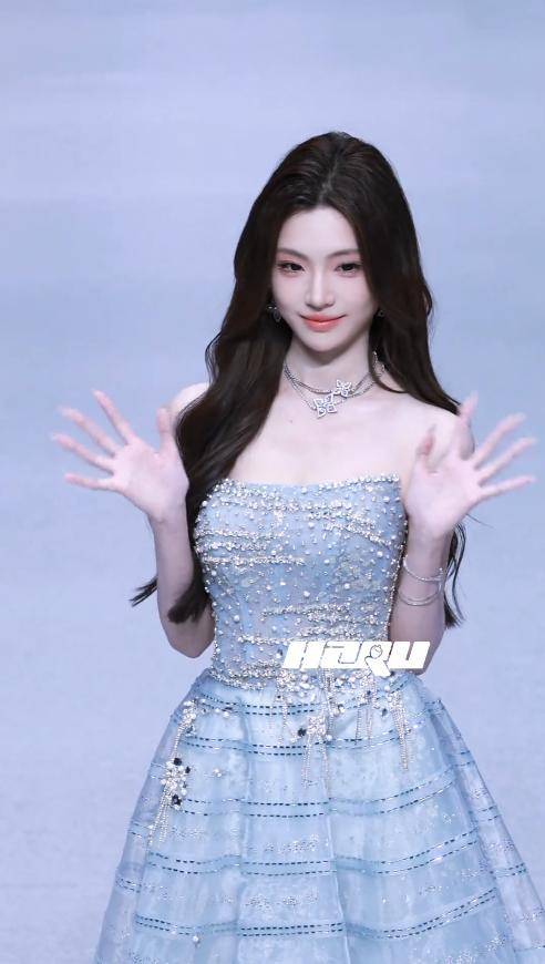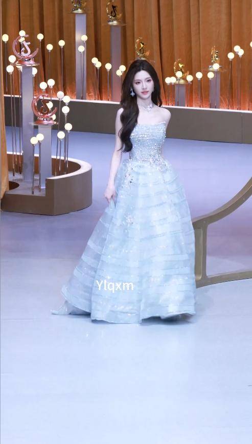一袭冰蓝色碎钻长裙,裙摆层层叠叠,上面缀满了细碎的碎钻,在灯光的照射下,每走一步都闪闪发光,像把星光穿在了身上。
