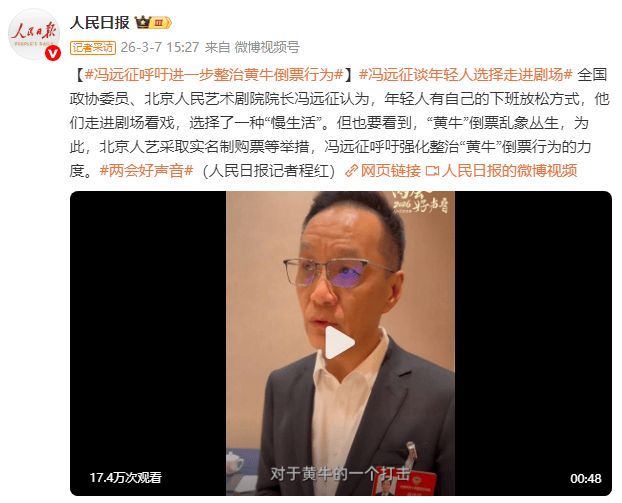 全国政协委员、北京人民艺术剧院院长冯远征认为,年轻人有自己的下班放松方式,他们走进剧场看戏,选择了一种“慢生活”。但也要看到,“黄牛”倒票乱象丛生,为此,北京人艺采取实名制购票等举措,冯远征呼吁强化整治“黄牛”倒票行为的力度。