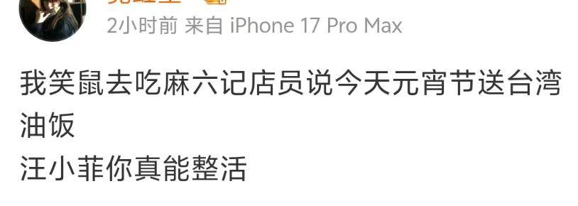 晒娃之后沉寂了不到一周时间,汪小菲一家又出来刷存在感了。元宵节当天,有网友爆料,今天在汪小菲旗下餐厅吃饭时,店里送了台湾传统美食,正好呼应了他现任老婆马筱梅的籍贯。这举