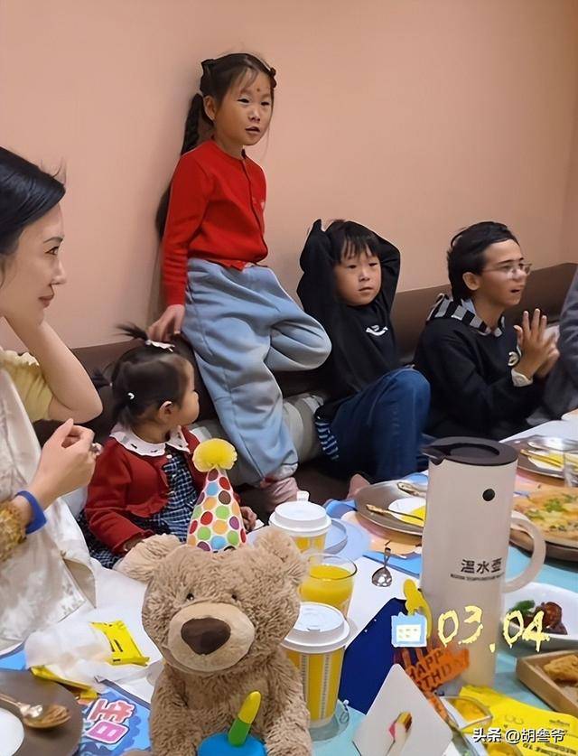 家庭聚会上,四个孩子排排坐,张纪中亲自点燃插着7根蜡烛的巧克力蛋糕,杜星霖在一旁主持大局,一家人其乐融融。