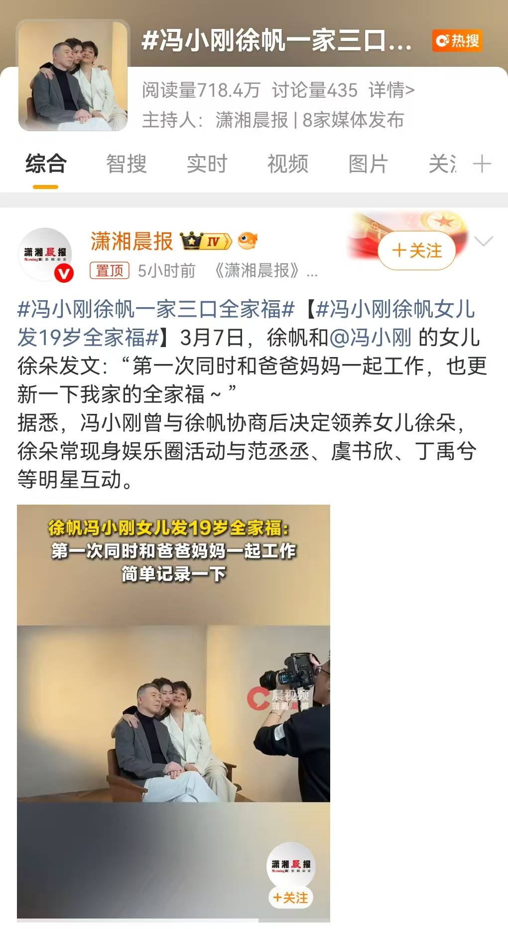 3月7日,徐朵晒出一段拍摄杂志的花絮视频,瞬间暖爆全网——视频里,她与父亲冯小刚、母亲徐帆同框出镜,画面温馨治愈,徐朵声音温柔地说道:“这次是我们三个人一起工作,简单记录一下,也更新一下我家的全家福。” 这罕见的一家三口同框名场面,既让人感受到他们的温情,也引发了全网对“星二代资源”的热议,反差感拉满。