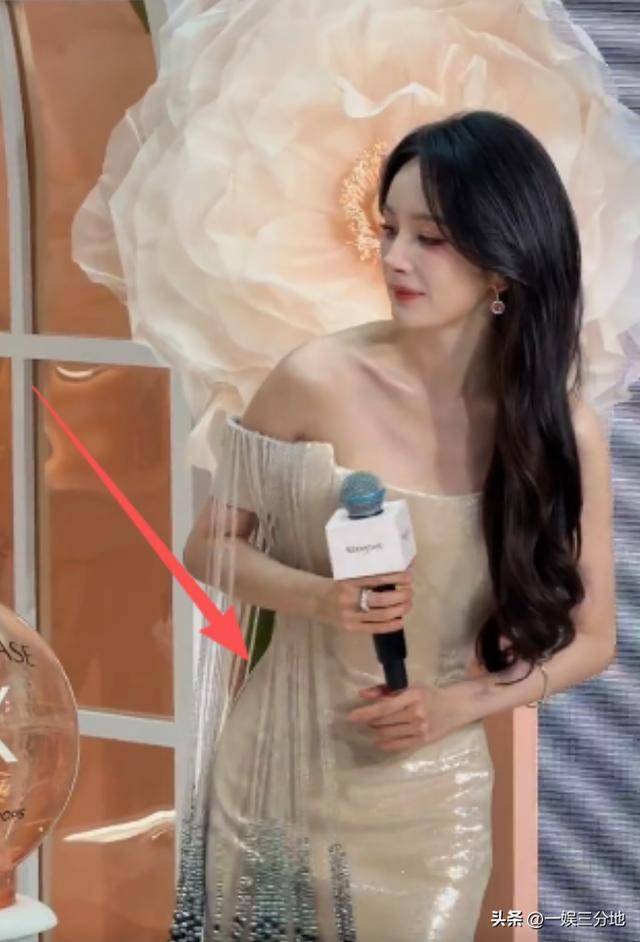 今天这套衣服选的也很适合她,香槟色的抹胸长裙,胳膊两边还做了流苏的设计,搭配上一头卷发,简直是仙女下凡。