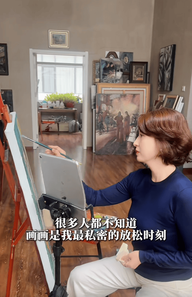 现身画室的张蕾身着深蓝色长袖上衣与浅色休闲裤,端坐于画架前,神情专注而沉静,目光凝视画布,嘴角微抿,流露出对艺术创作的投入与享受。