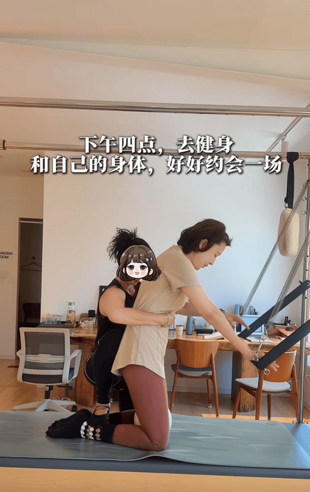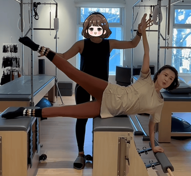 47岁的张蕾身材修长匀称,四肢线条流畅,尤其腿部肌肉紧致有力,展现出长期坚持锻炼的成果。在普拉提器械上的张蕾充分体现了良好的身体控制力与柔韧性。她的神情专注而从容,嘴角微扬,流露出对运动的享受与自信。