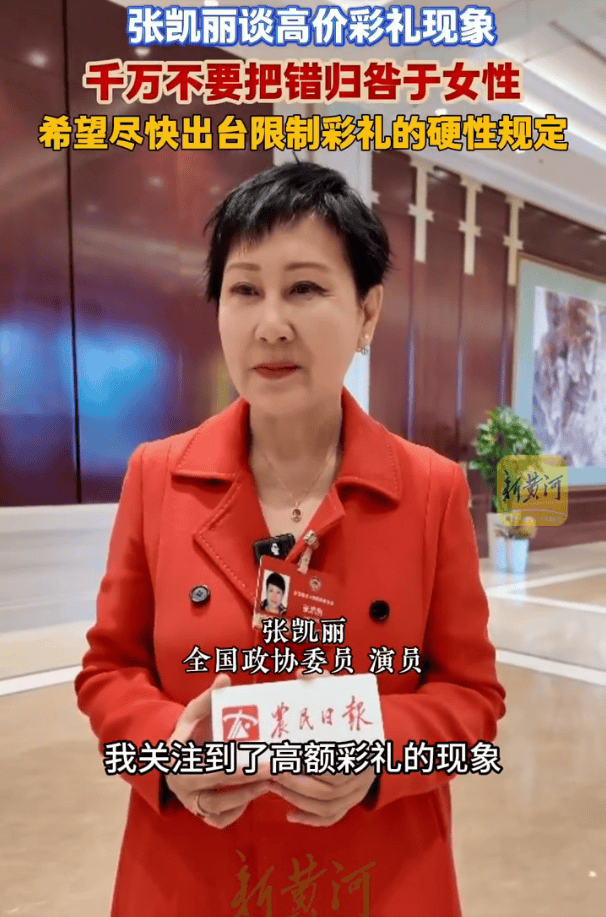 全国政协委员张凯丽在接受媒体采访时谈到高价彩礼这个热门话题,她表示关注到了这一现象,确实比较普遍。但她希望不要把错误归咎于女性,“它屡禁不止的原因是多种多样的,我觉得这不是女性的错,千万不要把错误归咎于她们身上。”在她看来,彩礼的数字并不能代表什么,幸福的婚姻永远要靠两个人的双手去创造。另外她关注到了,有政协委员也提出了彩礼的数额建议,希望尽快出台硬性规定限制彩礼的数额。