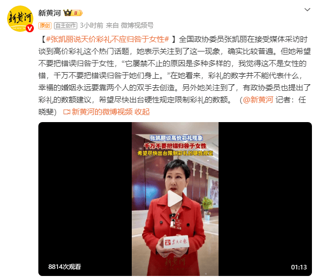 (来源:新黄河)全国政协委员张凯丽在接受媒体采访时谈到高价彩礼这个热门话题,她表示关注到了这一现象,确实比较普遍。但她希望不要把错误归咎于女性,“它屡禁不止的原因是多