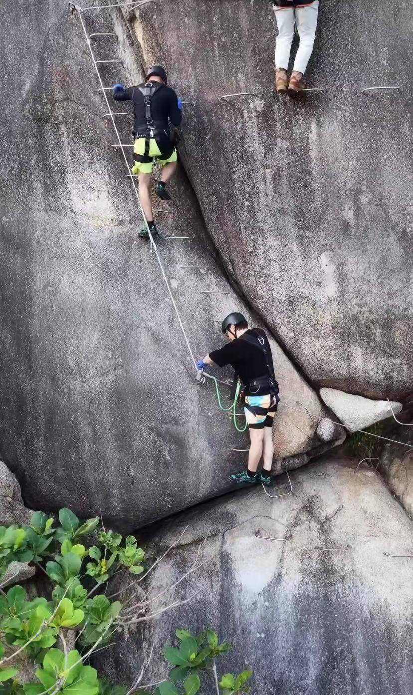 沈腾在蜈支洲岛挑战飞拉达(Via Ferrata),在悬崖峭壁间攀爬,全程未见紧张,面对游客拍照和围观,他淡定回应,甚至微笑打招呼,展现出极强的心理素质与亲和力。