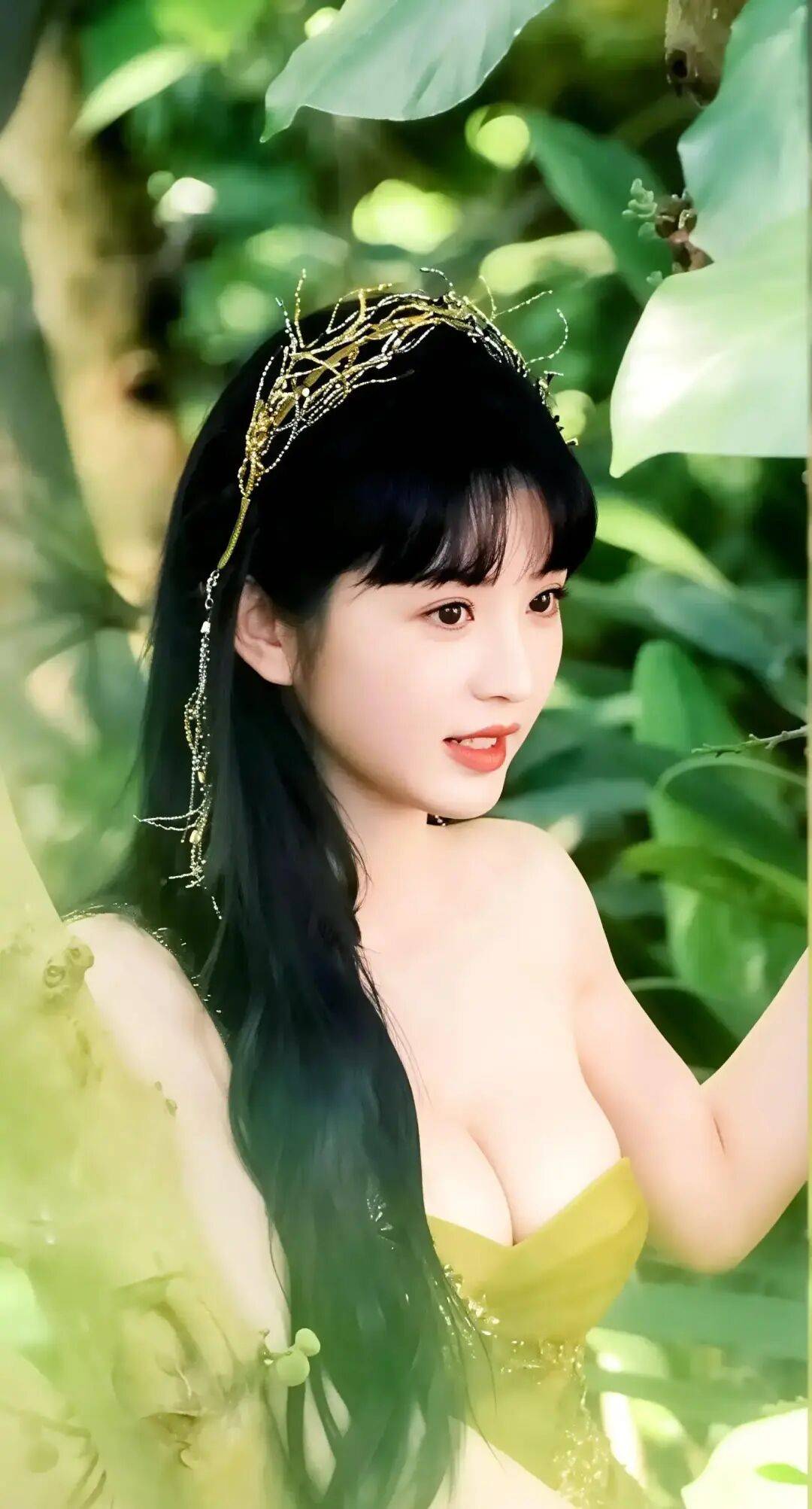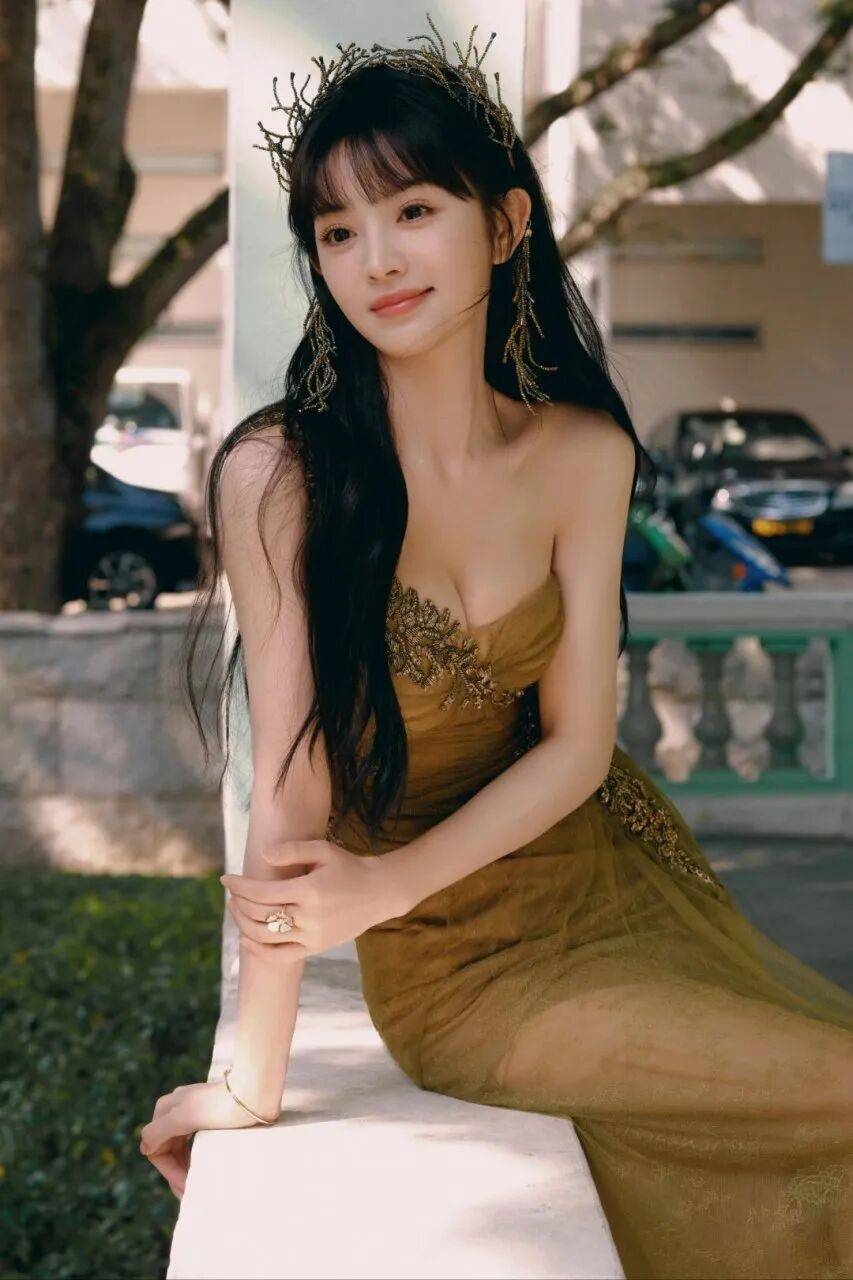 田曦薇穿着黄色抹胸衣裙,头戴珍珠头饰,她俏脸清丽,五官精致,唇红齿白,乌黑的长发飘逸,露出白皙的香肩和傲人的事业线,肌肤娇嫩如雪,丰满的魔鬼身材,绝对性感火辣!