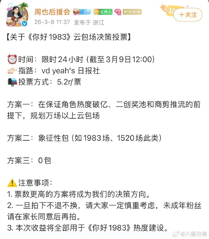 周也后援会设置三种方案供粉丝选择:万场包场、象征性包场(如1983场)、0包场。投票需支付5.2元/票,限时24小时,共7958人参与。
