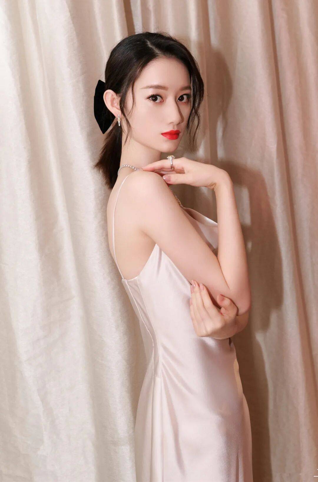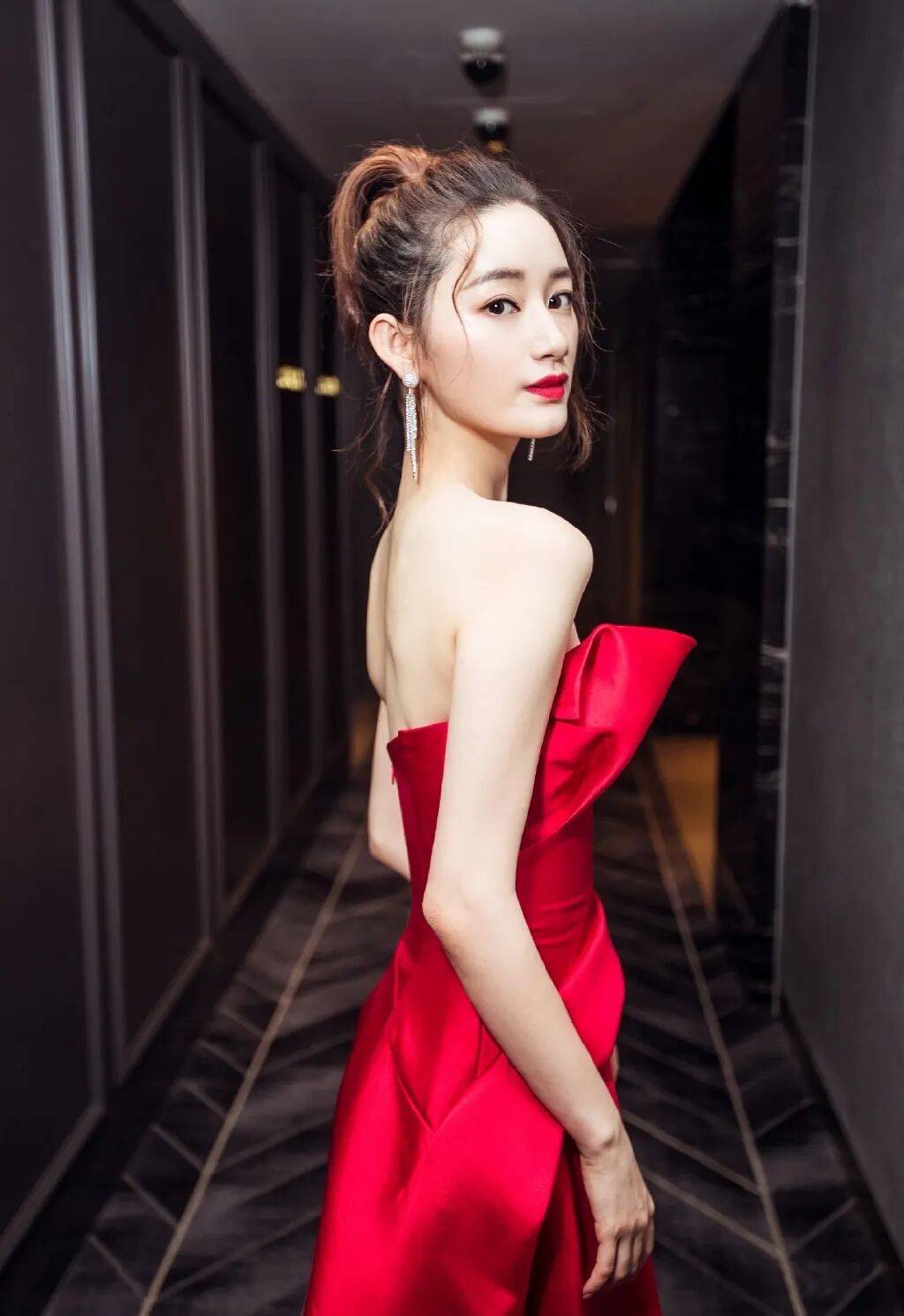 郭晓婷穿着红色抹胸衣裙,她俏脸清丽,长发盘起,露出白皙的香肩和事业线,双受扶着栏杆,大秀自己曼妙的身材曲线,绝对性感撩人!