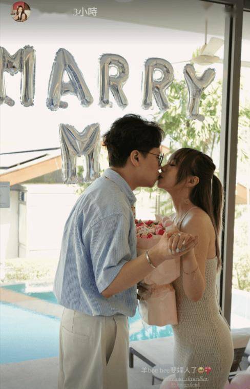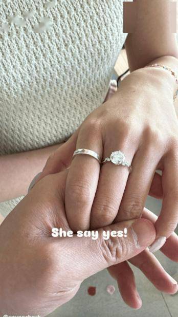 照片中,黄荣璋手捧大束鲜花,一脸深情地对着女友单膝下跪献上钻戒。黄荣璋随即开心写下:“She say yes!”,并晒出两人手牵手,未婚妻无名指戴着闪爆钻戒的特写照,隔着屏幕都能感受到甜蜜。
