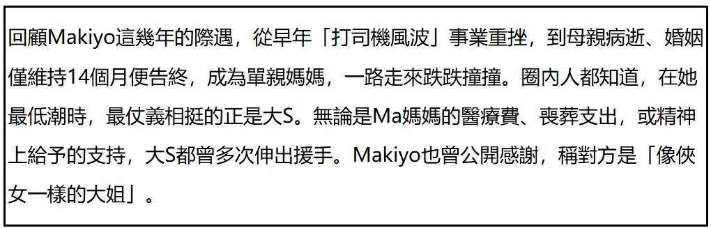 最近台媒一系列报道让外界再次意识到,大S的离世改变了太多人的生活,没有了大S的帮忙,她的好友Makiyo愈发沦落,险些带着儿子跌入斩杀线。Makiyo是大小S姐妹团成员,和大S、小S、范