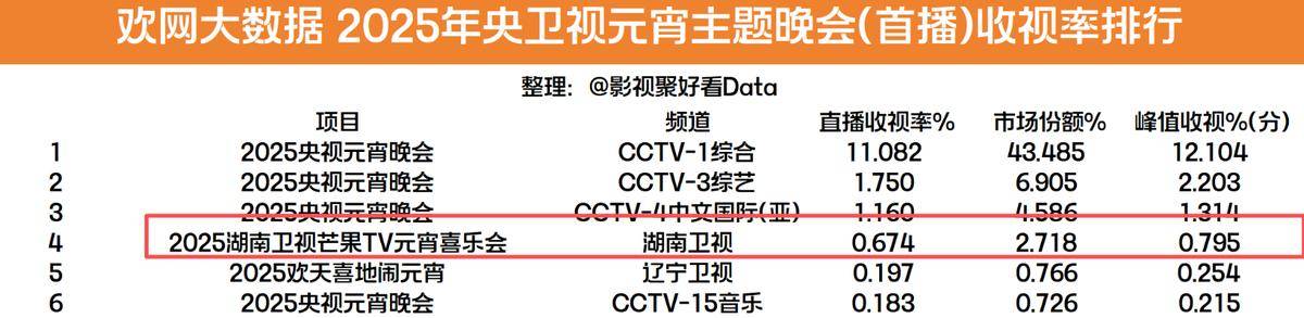 元宵节晚会收视率出炉,除去央视这个必然的冠军外,湖南台赢得很彻底,是卫视春晚里的断层第一。