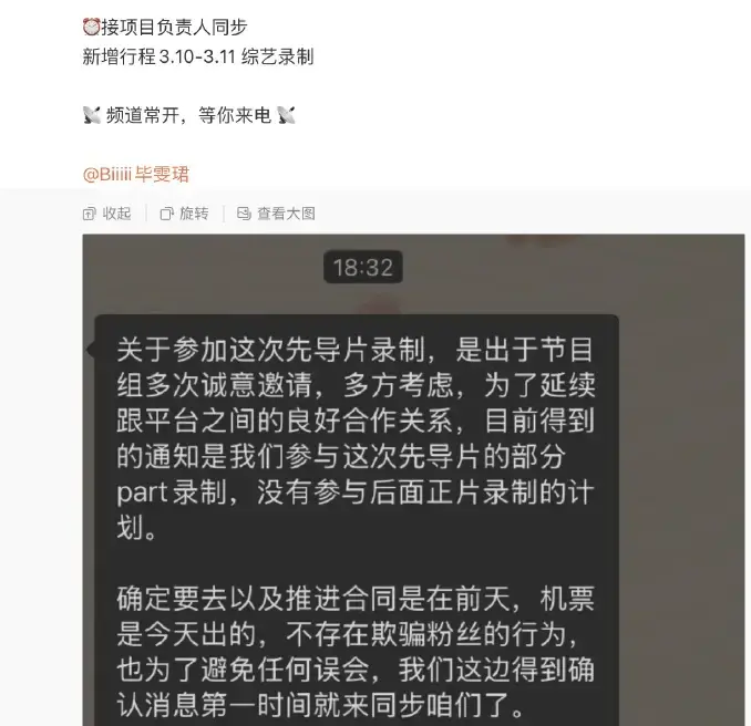 近日,网传毕雯珺张予曦将合体录制综艺的先导片。3月6日,毕雯珺对接确认了此事,并透露是节目组多次诚意邀请才答应录制。随后,毕雯珺粉丝表示团队明知粉丝群体普遍持反对态度的情况下,仍执意促成综艺录制。毕雯珺向粉丝解释,称在工作中有很多不可控的因素,“可能还是我不够好吧?我不够强大。”
