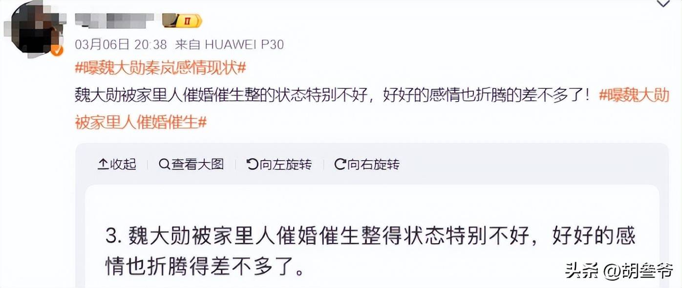 谁曾想,3月8日又有狗仔在某博爆料称,魏大勋被家里人催婚催生整的状态特别不好,好好的感情也折腾的差不多了。