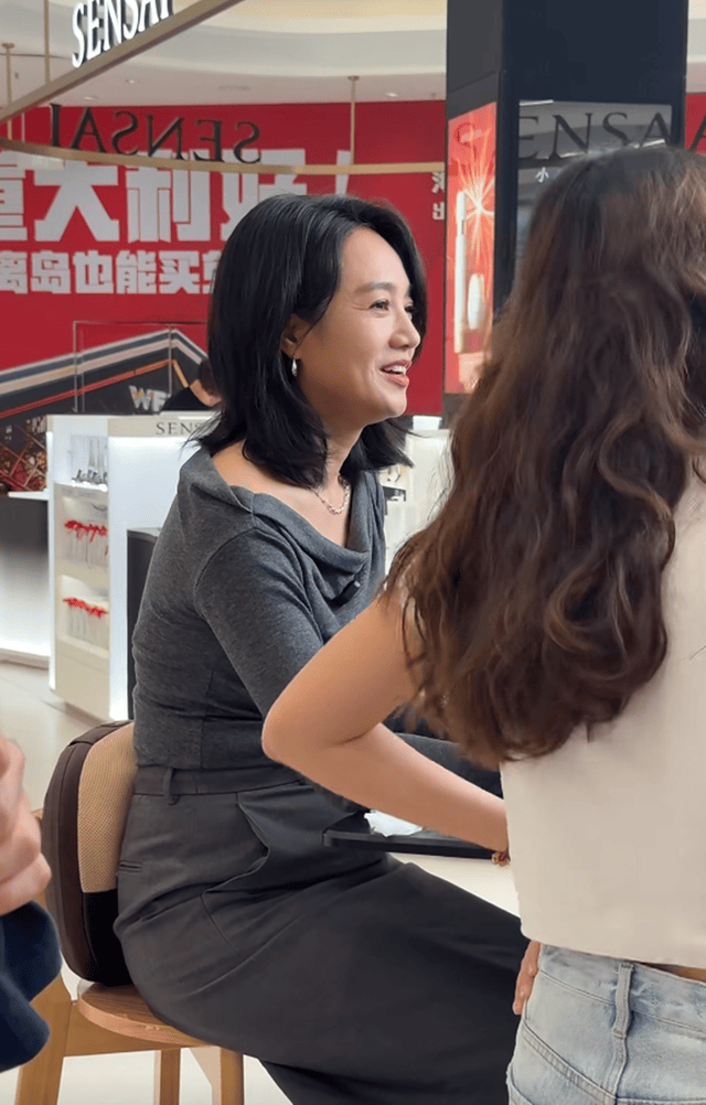 晒出的视频中,在某护肤品专柜前直播的朱丹,她身着一件灰色打底衫,领口设计略带宽松褶皱,既显随性又不失优雅。她留着一头乌黑柔顺的中长发,发尾微卷,自然披肩,侧脸轮廓柔和,面带微笑,眼神专注地望向镜头,流露出亲切与投入的神情。