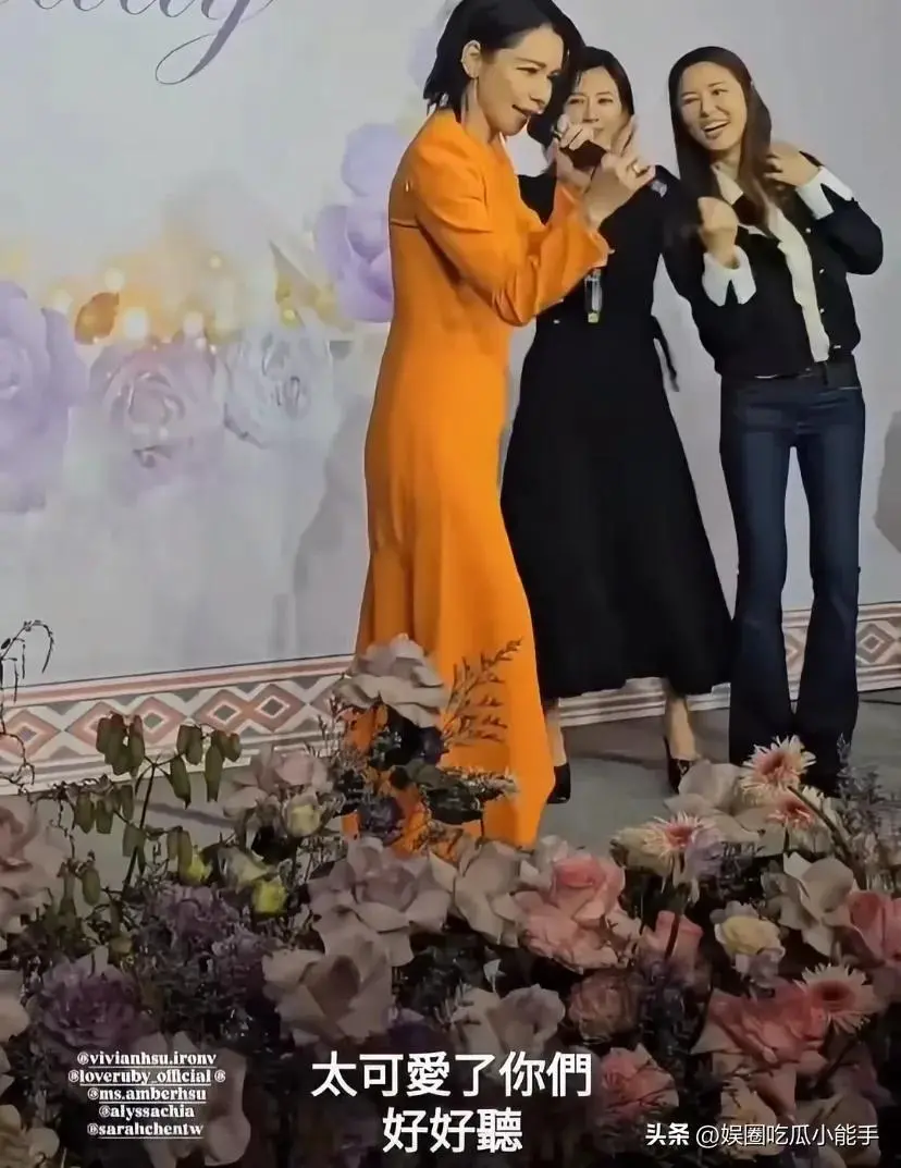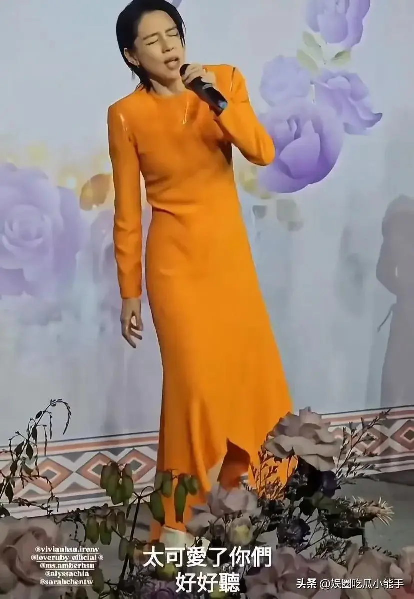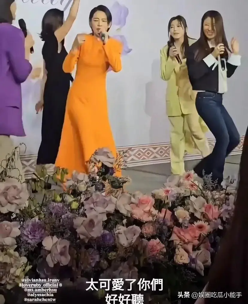 作为徐若瑄的闺蜜,林心如和贾静雯也来给徐妈妈祝寿。徐若瑄身穿一袭橙色修身长裙,和好友们一起在台上唱歌,如痴如醉。