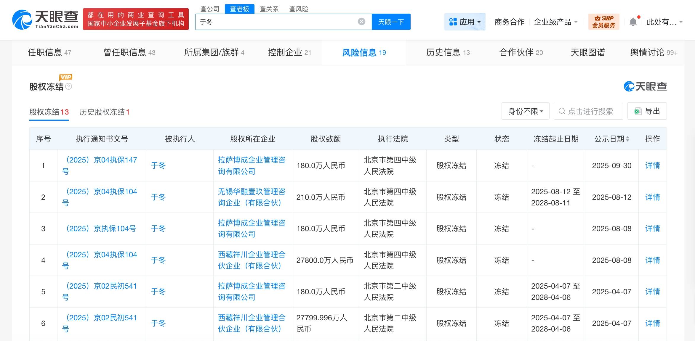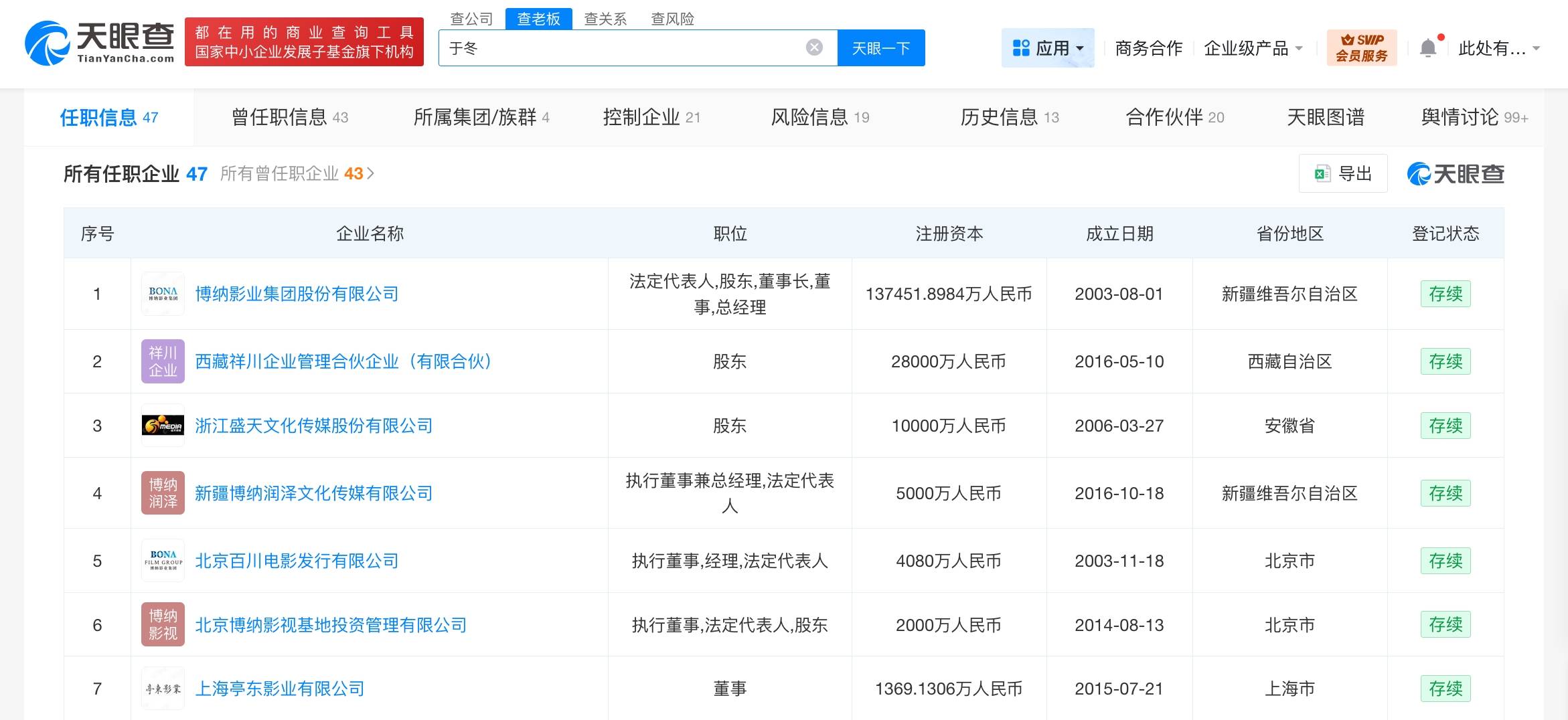 天眼查任职信息显示,于冬名下关联企业近50家,包括博纳影业集团股份有限公司、浙江盛天文化传媒股份有限公司、北京百川电影发行有限公司、上海亭东影业有限公司等,商业版图覆盖影视制作、发行、投资管理等领域,于冬在上述公司担任董事长、总经理、执行董事等职务。天眼风险信息显示,于冬所持多家公司股权已被冻结。