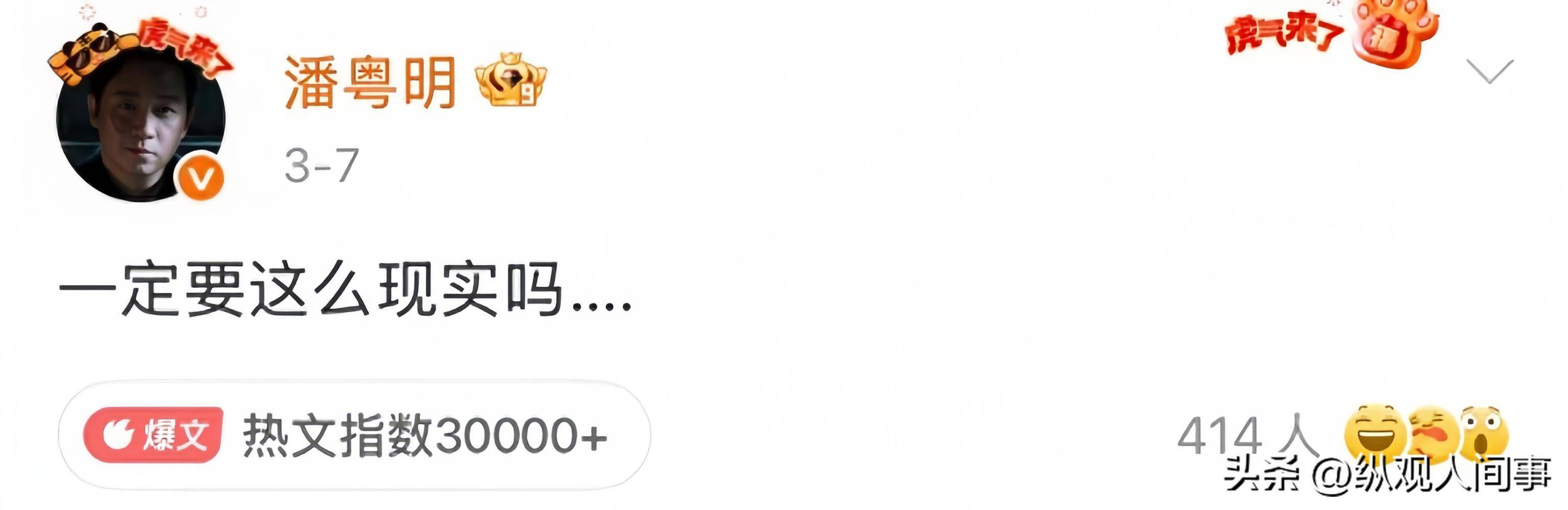 话题发酵的当晚,3 月 7 日深夜,潘粤明的社交动态突然更新,一句 “一定要这么现实吗…”,短短几个字裹着说不清道不明的复杂情绪,瞬间点燃全网讨论。