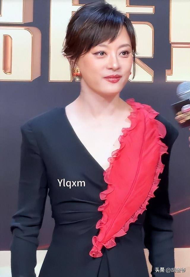 孙俪穿了一条黑红拼接的长裙,头发依旧挽在脑后,看着和她常留的短发造型没什么区别。