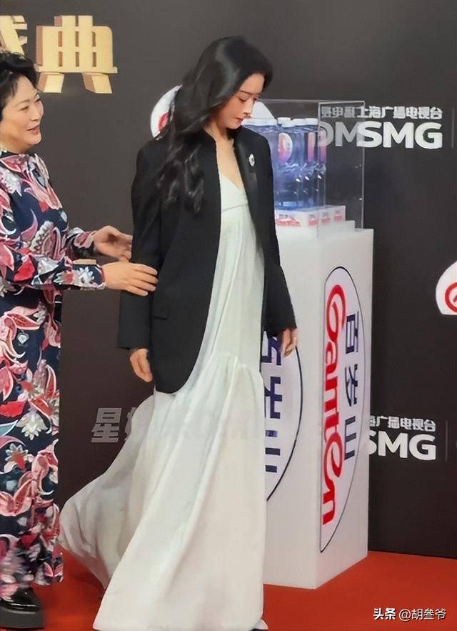 走红毯的过程中,她还不停地扶着肚子,生怕裙子被撑破。