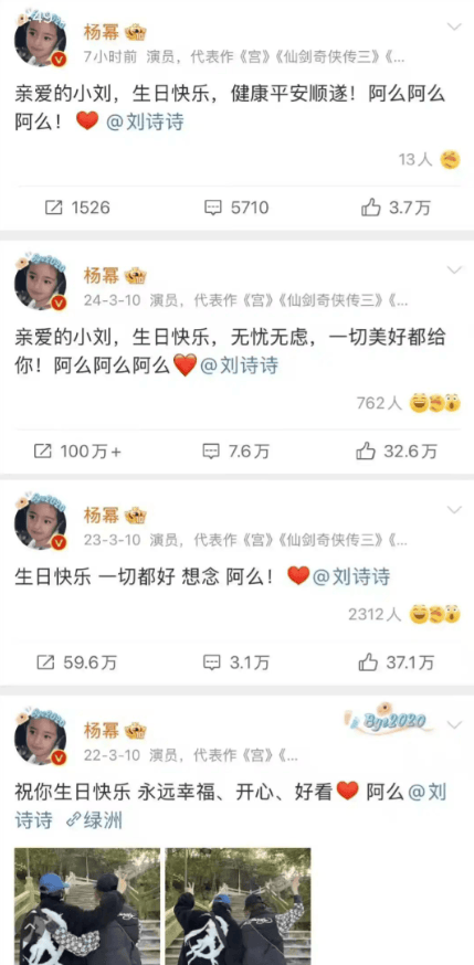 在3月10日,杨幂还在社交平台上为刘诗诗庆生,并且配文:生日快乐,顺顺利利,岁岁平安!想你阿么!感觉杨幂现在的祝福文都非常的真挚了,多少以前的好友都因为红不红或者还在不在圈内混而远离。