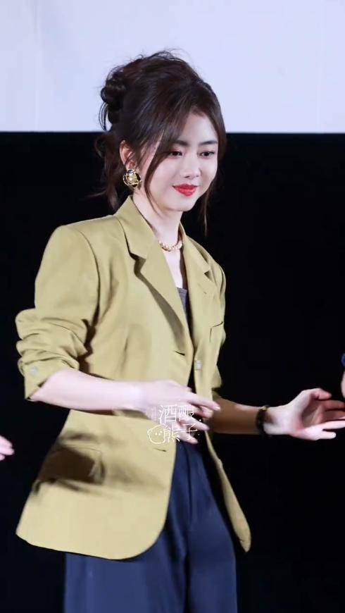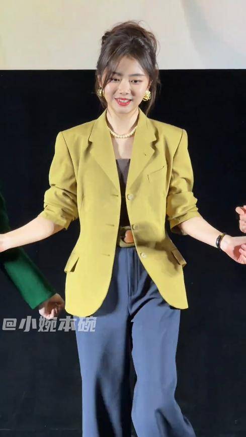 比圆脸双下巴更吸睛的,是她的身材。公开资料显示她身高162厘米,可当天她穿了一身黄色西装,宽松的版型不仅没显得干练,反而衬得她格外娇小。