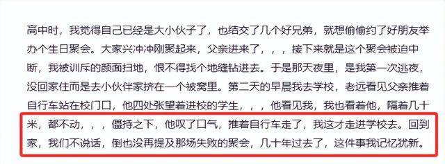 高中时他偷偷办生日聚会被父亲打断,颜面扫地的他第一次逃夜,第二天在校门口看到父亲推着自行车等他,两人隔着几十米僵持,最后父亲叹着气离开。
