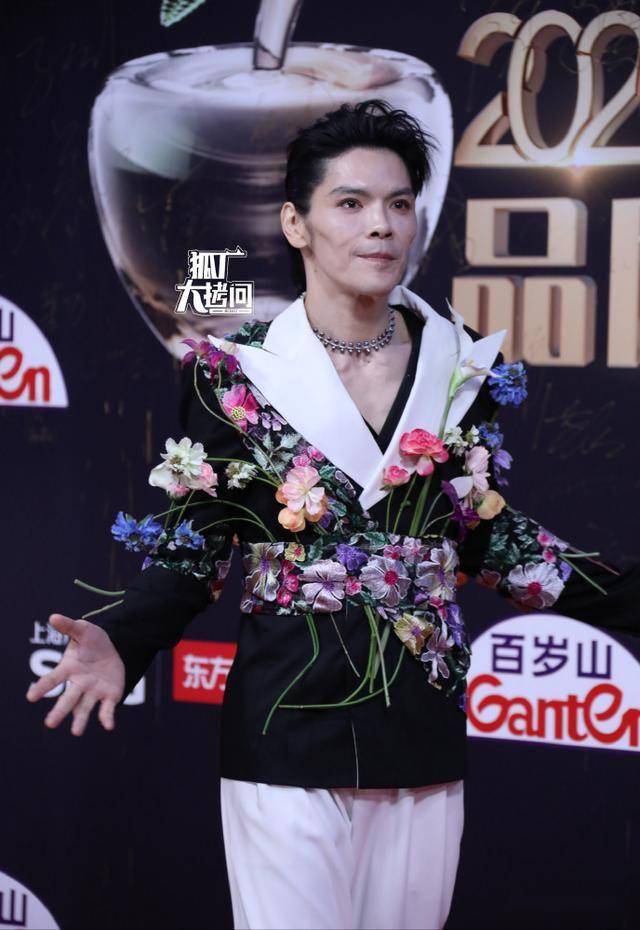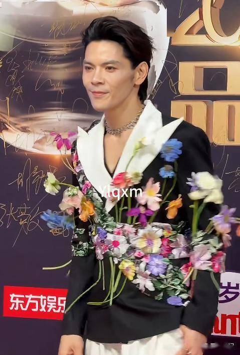 别人穿西装穿礼服,他直接把花束穿在身上,全身装饰满鲜花,远远看去像移动的花架,在红毯上格外扎眼。