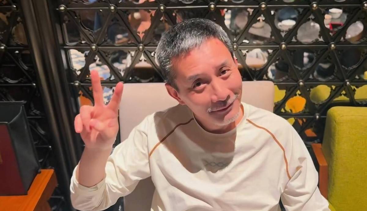 田小洁对着镜头比耶,精神状态很不错,皮肤紧致。显然,他平时还是很注重自己的保养。
