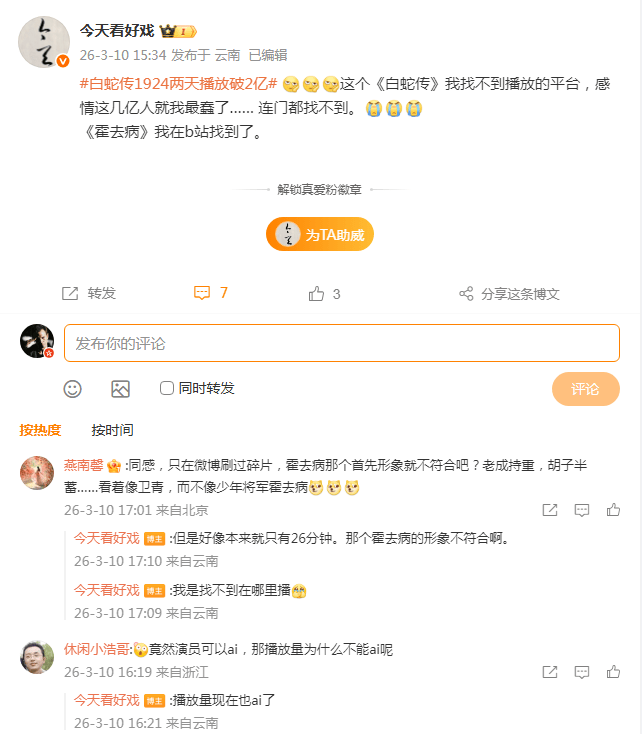 又网友直言,“演员可AI,播放量为何不能AI?”,认为高数据可能由算法生成,行业账号指出其播放量统计方式缺乏透明度。