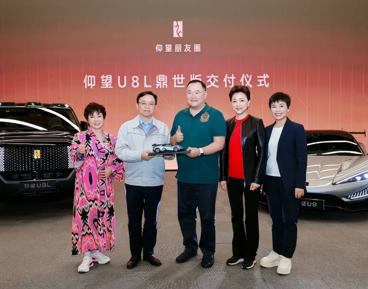 吴征一到现场就点名要去看那辆绿色的腾势Z9GT,他穿了件军绿色短袖,配着黑色西装裤和皮鞋,肚子挺得老高,看着大腹便便的,虽说透着点老板的气场,但也难掩油腻。
