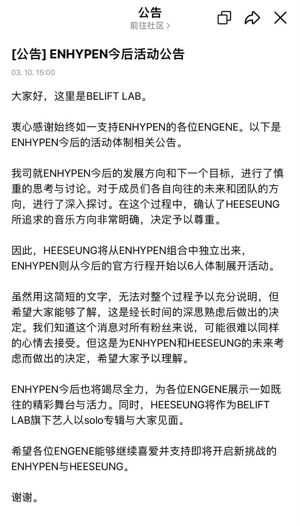 有粉丝玩梗:“以后ENHYPEN的应援口号要改成‘六个人,一条心,李羲承solo也加油’!”(公司:这届粉丝真难带!)李羲承退队后,粉丝最关心的是他的solo发展。Kpop圈退队solo的先例不少,比如BTS的田柾国、GOT7的王嘉尔,都混得风生水起。